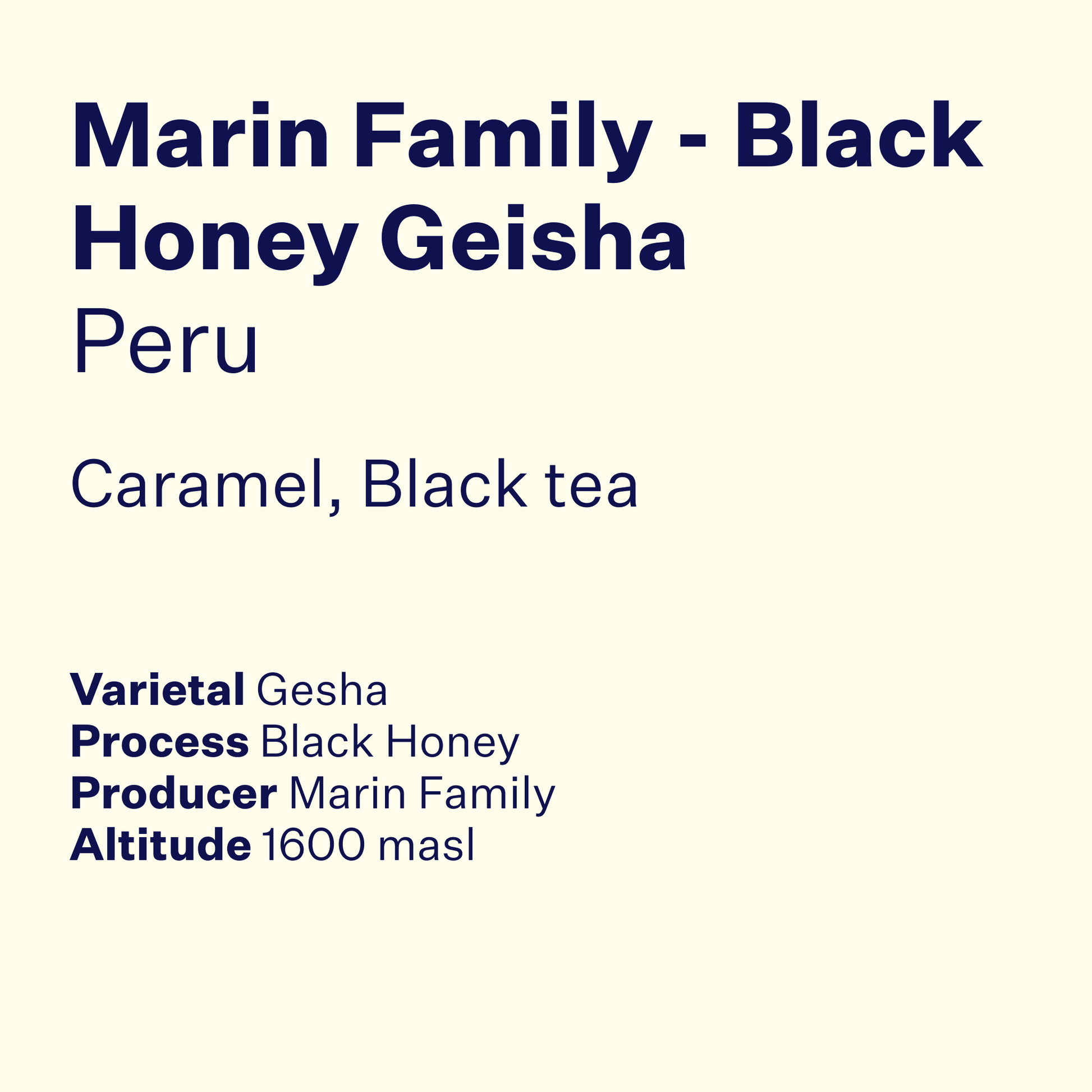Produced by the Marin Family in Peru, coffee cherries from mature trees undergo a three-day fermentation in trays, followed by additional fermentation covered in dark mantles. The beans are dried in darkness for 15 days, then under a solar roof for 10 days, creating a black honey processed coffee.